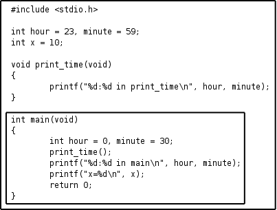 则第一次调用print_time打印的是全局变量的值,第二次直接调用printf打印的则是main函数局部变量的值。在C语言中每个标识符都有特定的作用域,全局变量是定义在所有函数体之外的标识符,它的作用域从定义的位置开始直到源文件结束,而main函数局部变量的作用域仅限于main函数之中。如上图所示,设想整个源文件是一张大纸,也就是全局变量的作用域,而main函数是盖在这张大纸上的一张小纸,也就是main函数局部变量的作用域。在小纸上用到标识符hourminute时应该参考小纸上的定义,因为大纸(全局变量的作用域)被盖住了,如果在小纸上用到某个标识符却没有找到它的定义,那么再去翻看下面的大纸上有没有定义,例如上图中的变量x