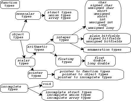 第 1 节 “复合类型与结构体”讲过算术类型、标量类型的概念,现在又学习了几种类型,我们完整地总结一下C语言的类型。下图出自[Standard C]